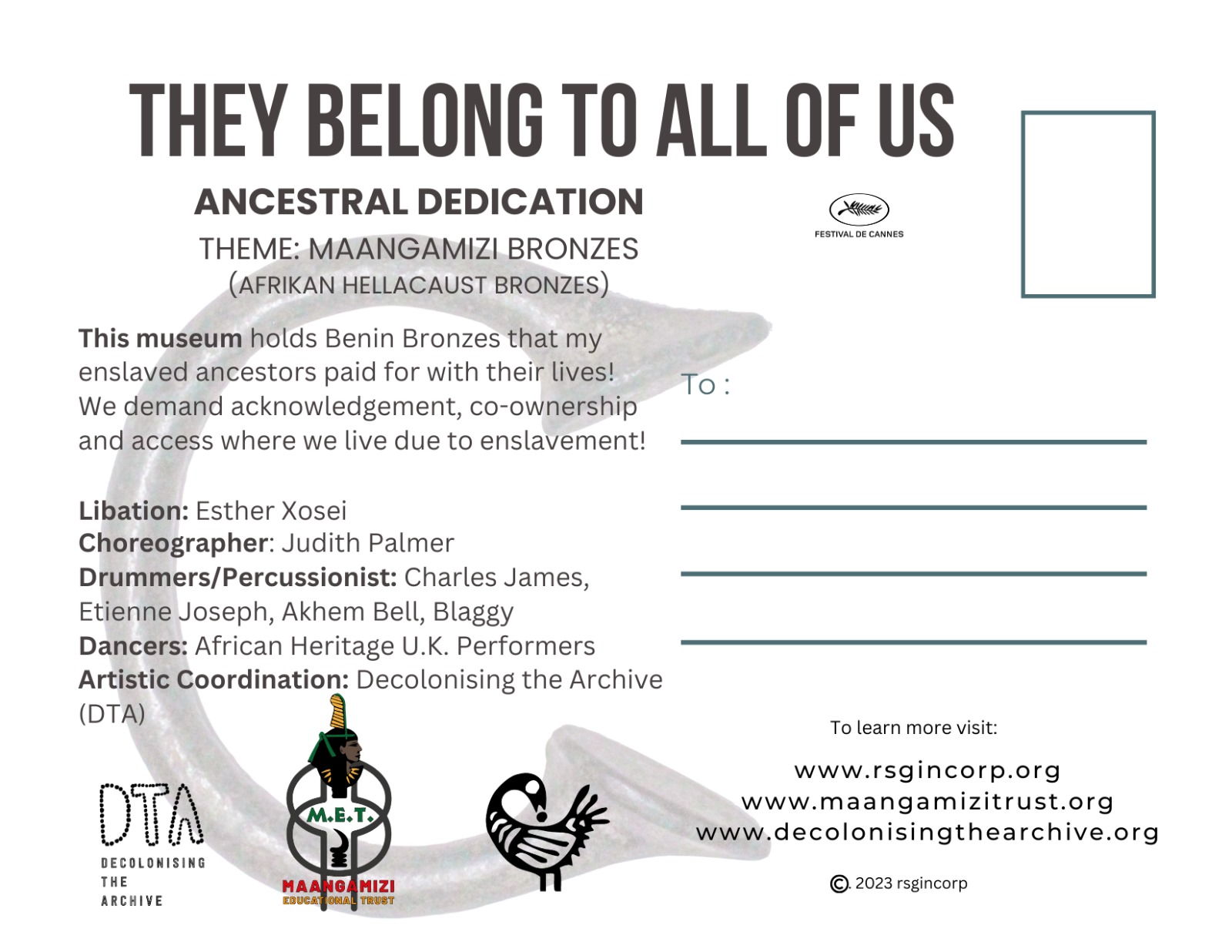 Join the Maangamizi Educational Trust, Decolonising the Archive, the Restitution Study Group and friends on Saturday 2nd December 2023 at the entrance of the British Museum and the Horniman Museum for an Ancestral Dedication. The Ancestral Dedication themed Maangamizi (Afrikan Hellacaust) Bronzes is in remembrance and honour of our Ancestors who were trafficked and enslaved for the metal manillas refabricated into the Benin bronzes as part of the Maangamizi.