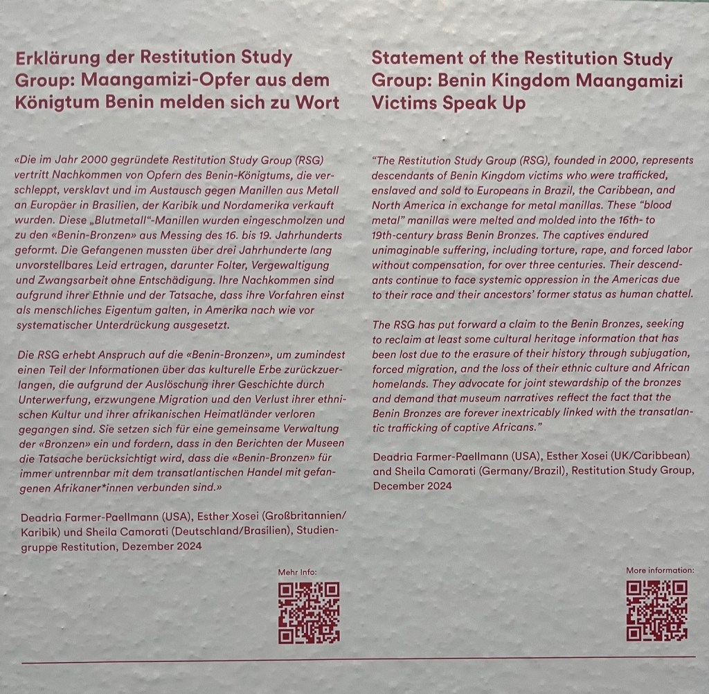 ZÜRICH, Switzerland — In a groundbreaking development for cultural heritage dialogue, Museum Rietberg has expanded its Benin Bronzes exhibition to include crucial perspectives from the Restitution Study Group (RSG), marking a significant step toward the inclusive stewardship of these historic artifacts. The exhibition, which concludes on February 16, 2025, now features a dedicated panel highlighting the often-overlooked connection between the Benin Bronzes and the transatlantic slave trade and link to the award winning film, “They Belong to All of Us — The Benin Bronze Slave Trade Story.”