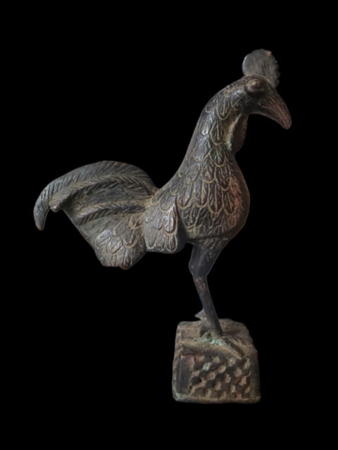 In Benin tradition, the bronze cockerel symbolizes vigilance, leadership, and warning. Associated with the Iyoba (Queen Mother), these pieces were placed near royal altars to represent protection and heightened awareness.